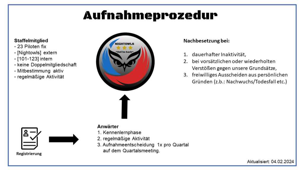 Bevor ein Interessent oder Interessentin ein fester Bestandteil der Gruppe sein kann, muss er/sie eine Reihe von Hürden überwinden, die innerhalb der Aufnahmeprozedur als Eignungsphase zusammengefasst werden. Um an diesem Verfahren teilnehmen zu können, muss er/sie zunächst eine Registrierung auf dieser Seite vornehmen. Auf diese folgt eine persönliche Einladung auf unseren Discord Server auf die angegebene E-Mail Adresse. Bei der Bewerbung sind folgende Grundvoraussetzungen zu berücksichtigen und müssen ausnahmslos auf die Anwärter zutreffen: